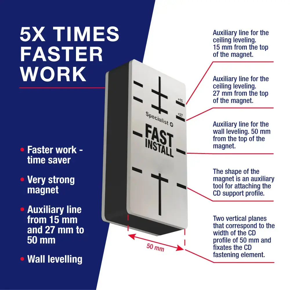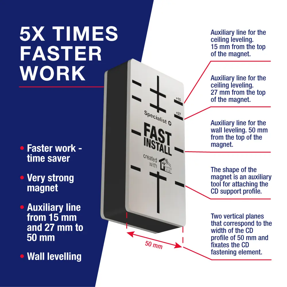 FAST INSTALL magnet for drywall is an aid for quick assembly and levelling of drywall metal frame. Laser-engraved on the magnet will make the work easier and faster.